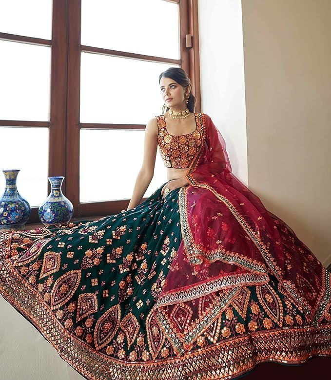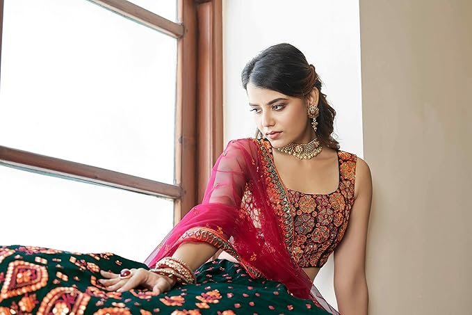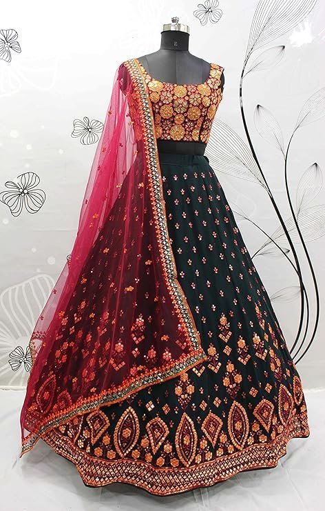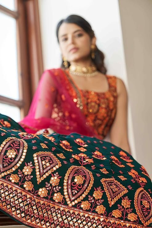 - Lehenga Color: GREEN || Choli Color: GREEN || Dupatta Color: DEEP PINK Lehenga Fabric(Semi-Stitched): GEORGETTE || Choli Fabric(unstitched): GEORGETTE || Dupatta Fabric: NET