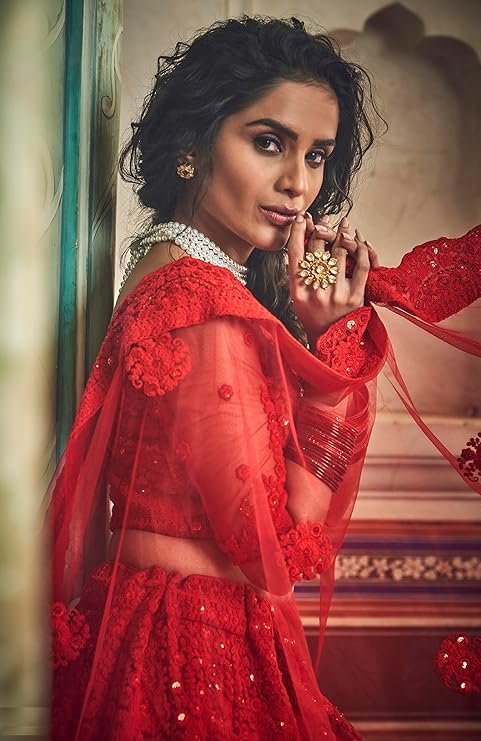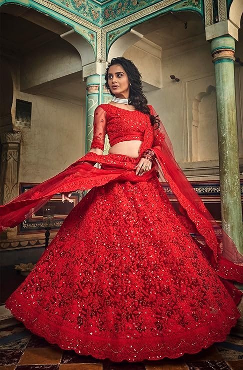 Divine Exim Women’s Net Semi Stitched Lehenga Choli with Dupatta | Traditional, Wedding, Ethnic Wear Lehenga | Dori and Sequin Embroidery Pattern (Red)