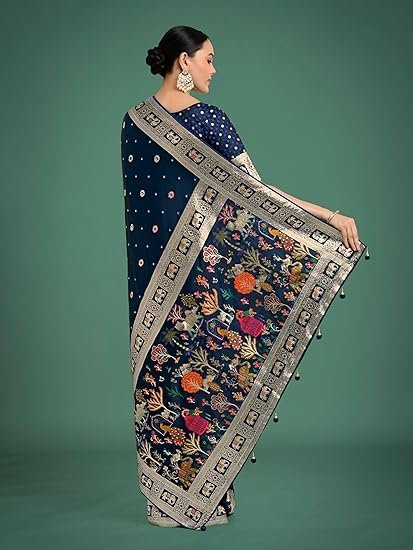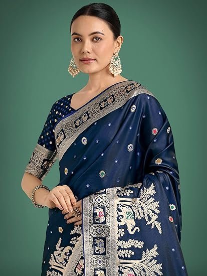 Product Highlights : Fabric: Banarasi Satin Silk (Saree & Blouse) || Work: Zari Weaving (Saree), Zari woven (Blouse) || Colour: Saree –Blue| Blouse – Blue|| This exquisite Banarasi satin silk intricate zari weaving elevates the classic into a regal statement.