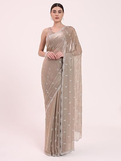 FIORRA Women’s Beige Organza Crushed Siroski Work Embellished Border Saree