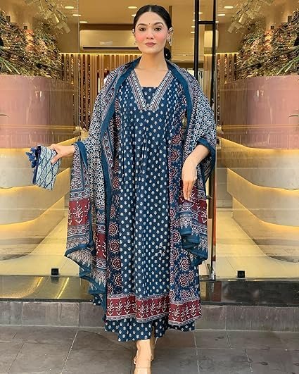 - · 👗 Complete 3-Piece Set – Includes Anarkali-style kurta, matching pant, and pure cotton dupatta – a complete cotton suits for women with dupatta option for special occasions and casual outings.