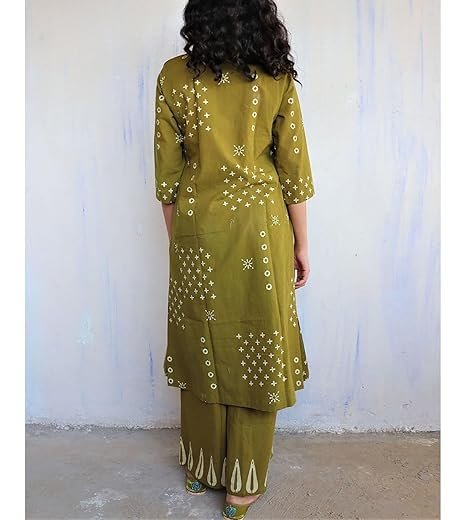 🌿 Elegant A-Line Flared Kurta Set for Women: Designed with a flowy silhouette and traditional Bandhani/block prints, this olive green kurta palazzo set blends style with ethnic grace.