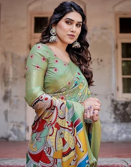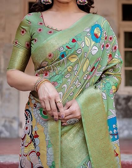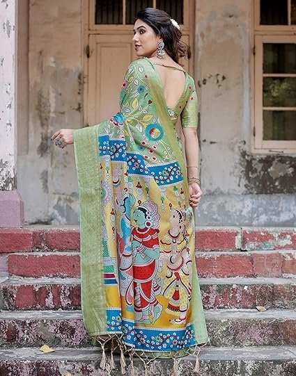 • Saree Details : Saree Fabric: Silk | Blouse Fabric: Tussar Silk | Saree Work: Kalamkari Printed, Jacquard, Tassels | Blouse Work: Printed, Weaving Border | Saree Color: Pista Green & Multi | Blouse Color: Pista Green
