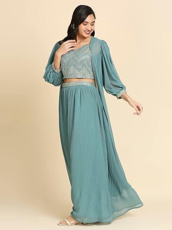 - BEST OF COMFORT AND STYLE: Made from Georgette material Solid With Heavy Embroidery Work And New Style V-Neck A Front-Slit 3 Piece Skita And Crop Top With Shrug Long Set. this Skirt And Crop top for women is designed to comfort all day long. The fabric is helping you keep cool and dry during summer.