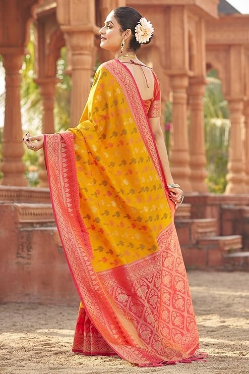 Bold and beautiful, this Kanchipuram Patola KING & QUEEN ATTRACTIVE silk Yellow color brocade saree is all about impactful presence.