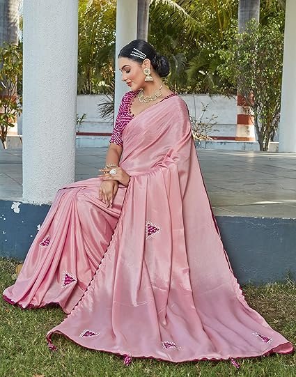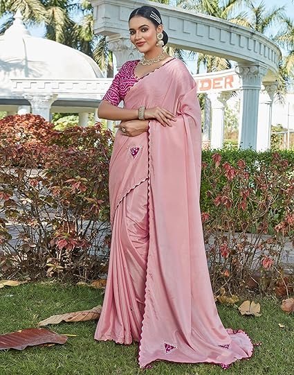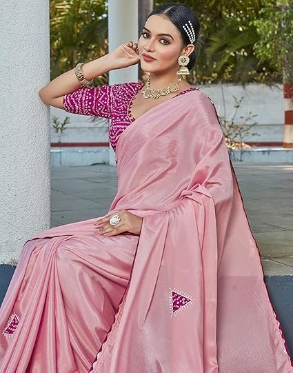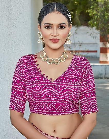 Saree Details : Saree Fabric: Cotton Silk | Blouse Fabric: Cotton Silk | Saree Work: Patch Work Stone Work | Blouse Work: Bandhani Printed, Foil Printed | Saree Color: Rose Pink | Blouse Color: Magenta